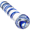 Lasilaten vakuuttava, läpinäkyvä varsi on kauniisti kohojuovitettu sinisellä spiraalilla, joka hieroo ihanasti vaginan seinämiä sauvan liikkuessa sisään ja ulos. Tyven paksu pallura mahdollistaa lisäksi peppukäytön. Voit toki kokeilla sauvaa myös toisinpäin, vaihtelua maybebaby!