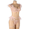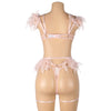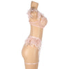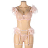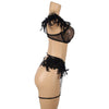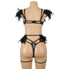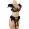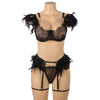 Tässä setissä yhdistyvät pitsi, kevyet ketjut ja pehmeät höyhenkoristeet – näyttävä ja leikkisä kokonaisuus. Täydellinen, kun haluat jotain aivan erityistä. Rintaliiveissä, stringeissä sekä sukkanauhavyössä on säätömahdollisuus.